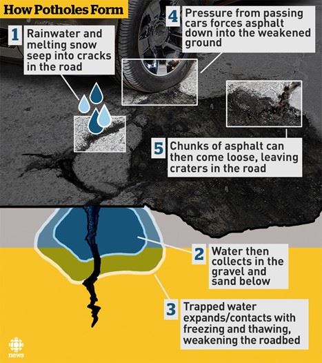 Potholes can occur in a number of ways - all of them have to do with water, the spring thaw and cracks in the road surface.