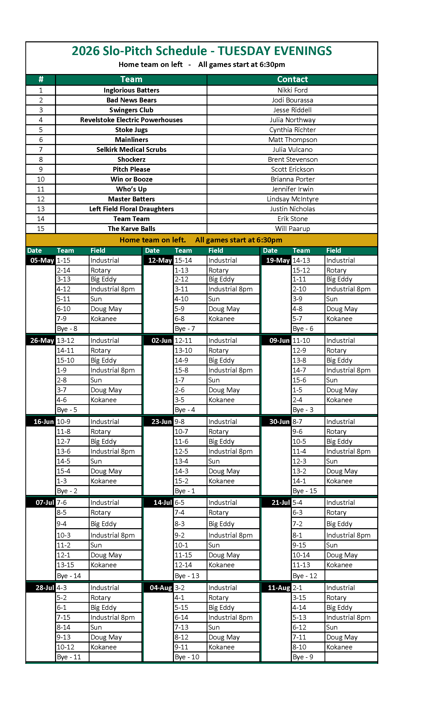 The completed team list needs to be emailed to prc@revelstoke.ca